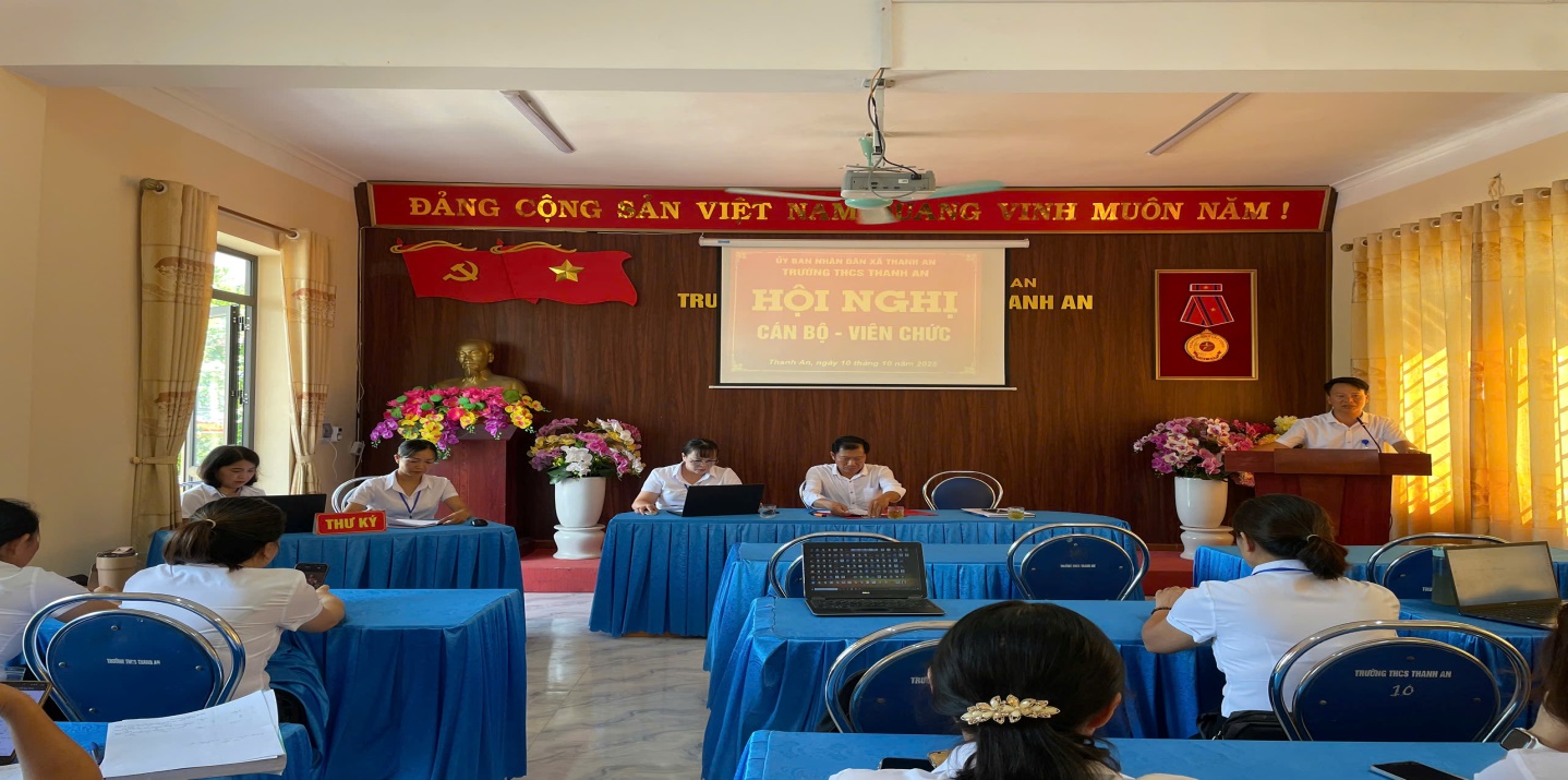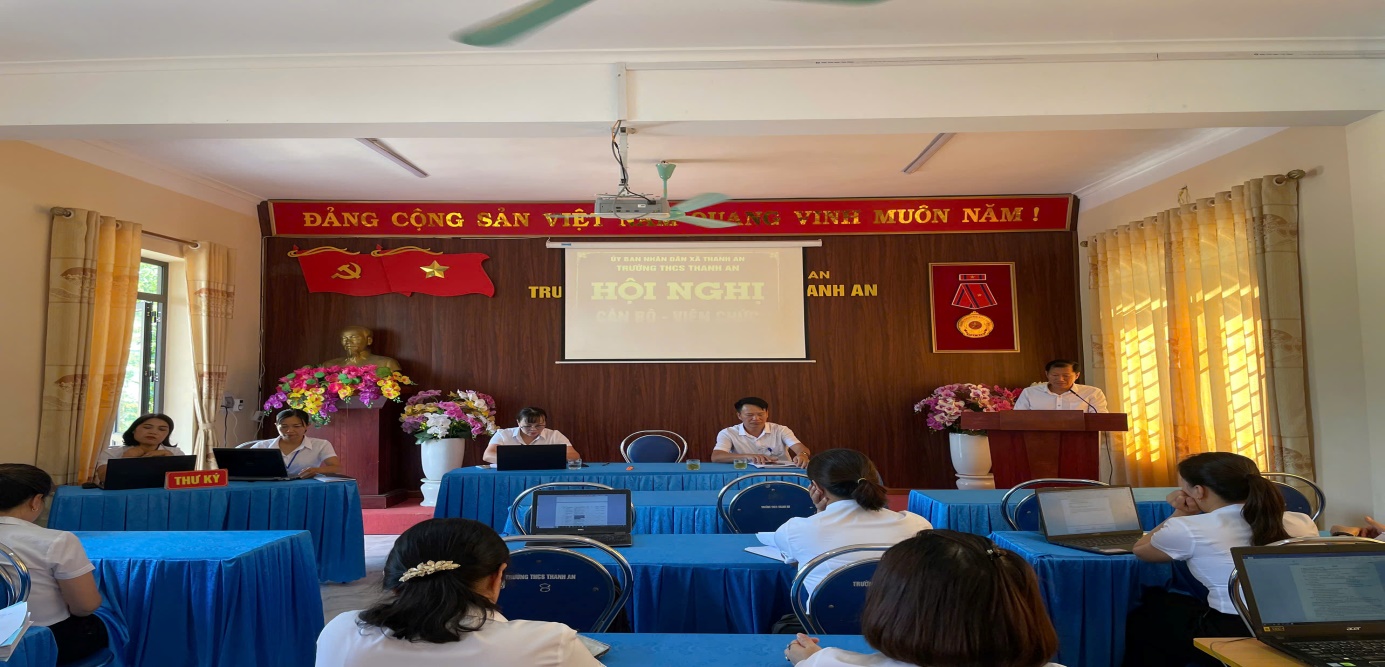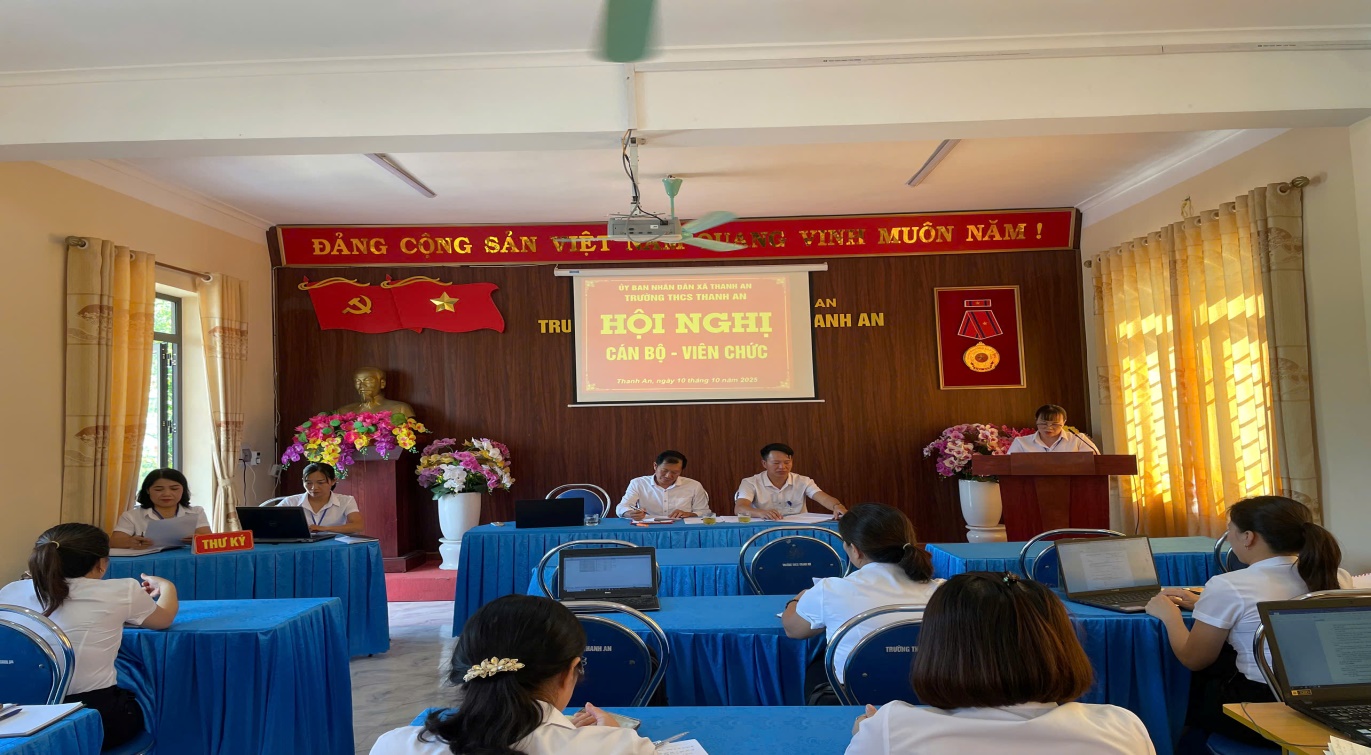 Năm học 2025 - 2026 là năm đầu tiên hệ thống chính quyền địa phương được tổ chức theo mô hình chính quyền hai cấp, đánh dấu bước chuyển quan trọng trong công tác quản lý, điều hành trên mọi lĩnh vực, trong đó có giáo dục và đào tạo. Đây cũng là năm toàn ngành giáo dục tiếp tục triển khai tinh thần Nghị quyết 71 của Bộ Chính trị về đột phá phát triển giáo dục và đào tạo, coi phát triển nguồn nhân lực chất lượng cao, bồi dưỡng thế hệ trẻ là nhiệm vụ then chốt để đáp ứng yêu cầu công nghiệp hóa, hiện đại hóa đất nước trong giai đoạn mới. Trong bối cảnh đó, chiều ngày 10 tháng 10 năm 2025, Trường THCS Thanh An đã long trọng tổ chức Hội nghị Cán bộ, viên chức năm học 2025 - 2026. Đây là dịp quan trọng để tập thể sư phạm nhà trường cùng nhìn lại, đánh giá kết quả thực hiện nhiệm vụ năm học 2024 - 2025; đồng thời thẳng thắn trao đổi, đề xuất những giải pháp, biện pháp cụ thể nhằm nâng cao chất lượng giáo dục toàn diện trong năm học mới. Hội nghị cũng là diễn đàn phát huy quyền làm chủ của đội ngũ cán bộ, giáo viên, nhân viên; thể hiện tinh thần đoàn kết, trách nhiệm và sáng tạo trong công tác, góp phần thực hiện thắng lợi nhiệm vụ năm học 2025 - 2026. Tới dự và chỉ đạo hội nghị có đồng chí Tường Duy Trung - Bí thư Chi bộ, Hiệu trưởng nhà trường; các đồng chí trong Ban Giám hiệu, cùng toàn thể cán bộ, giáo viên, nhân viên nhà trường. Đ/c Tường Duy Trung - Bí thư Chi bộ, Hiệu trưởng nhà trường phát biểu khai mạc và đánh giá kết quả thực hiện nghị quyết năm học 2024 - 2025 đồng thời triển khai nhiệm vụ năm học 2025 - 2026. Đ/c Phạm Kiên Cường - PHT thông qua dự thảo Quy chế làm việc của cơ quan Trong không khí trang nghiêm, dân chủ và trách nhiệm, hội nghị đã được nghe nhiều báo cáo quan trọng. Hội nghị đã thông qua phương hướng, chỉ tiêu thi đua năm học 2025 - 2026vàtrình bày quy chế bảo quản cơ sở vật chất và công tác tài chính của nhà trường. Đ/c Nguyễn Thị Hiền - PHT phát động và thông qua chỉ tiêu thi đua năm học 2025 - 2026 Hội nghị đã ghi nhận nhiều ý kiến tham luận tâm huyết, thiết thực như: “Giải pháp nâng cao chất lượng HSG lớp 9 cấp tỉnh”; “Ứng dụng công nghệ AI vào giảng dạy và Kiểm tra đánh giá”;Thảo luận nhất trí các chỉ tiêu thi đua trong năm học. Trong Hội nghị Cán bộ, viên chức Trường THCS Thanh An năm học 2025 - 2026 với tinh thần dân chủ, đoàn kết và trách nhiệm, hội nghị đã thống nhất những phương hướng, giải pháp,chỉ tiêu quan trọng khẳng định quyết tâm thực hiện thắng lợi nhiệm vụ năm học. Đây là tiền đề vững chắc để nhà trường tiếp tục phát huy tinh thần Nghị quyết 71 của Bộ Chính trị, thực hiện có hiệu quả chủ đề năm học 2025 - 2026 là: “Kỷ cương - Sáng tạo - Đột phá - Phát triển”. Sau thời gian làm việc khẩn trương và nghiêm túc. Hội nghị Cán bộ, viên chức Trường THCS Thanh An năm học 2025 - 2026 đã thành công tốt đẹp. Trên tinh thần dân chủ, đoàn kết và trách nhiệm cao. Sự đồng lòng, nhất trí của toàn thể cán bộ, giáo viên, nhân viên là động lực to lớn để nhà trường tiếp tục phát huy tinh thần đổi mới, sáng tạo. Với khí thế và quyết tâm cao, tập thể Trường THCS Thanh An sẽ phấn đấu hoàn thành xuất sắc các nhiệm vụ đề ra, góp phần xây dựng nhà trường ngày càng phát triển vững mạnh, đáp ứng yêu cầu đổi mới trong giai đoạn hiện nay.